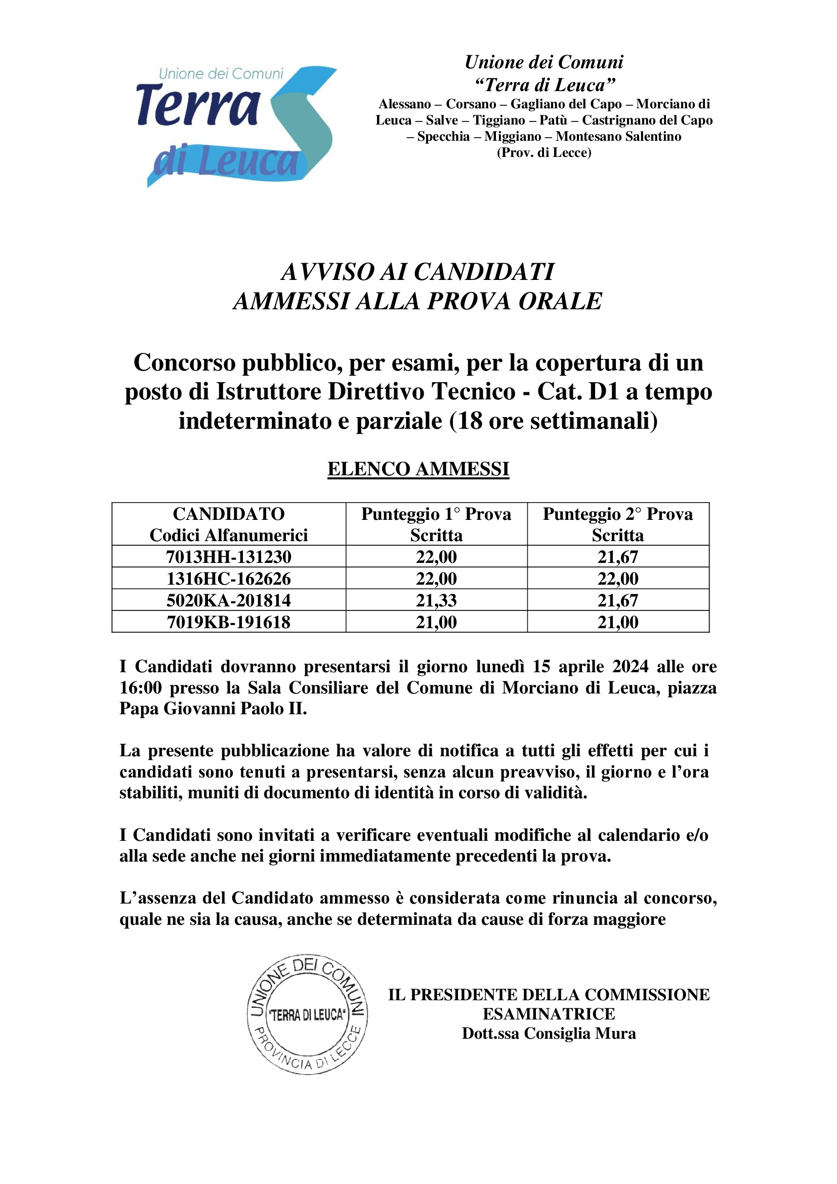 La presente pubblicazione ha valore di notifica a tutti gli effetti per cui i candidati sono tenuti a presentarsi, senza alcun preavviso, il giorno e l’ora