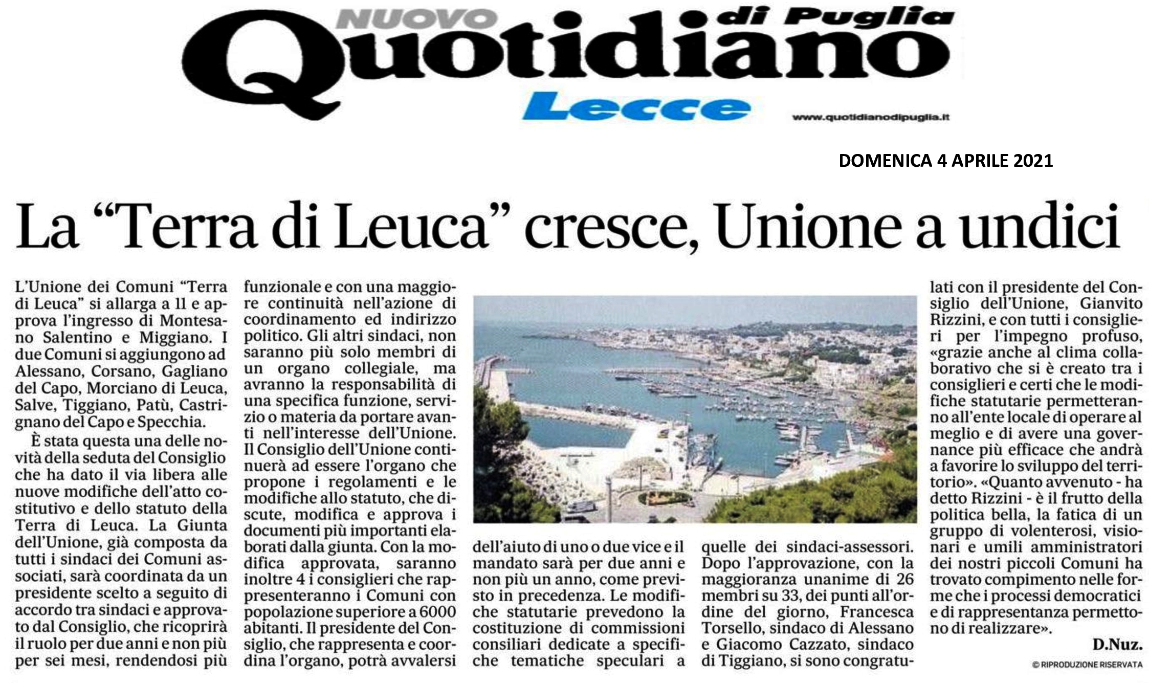 Quotidiano di Puglia – La Terra di Leuca cresce, unione a undici